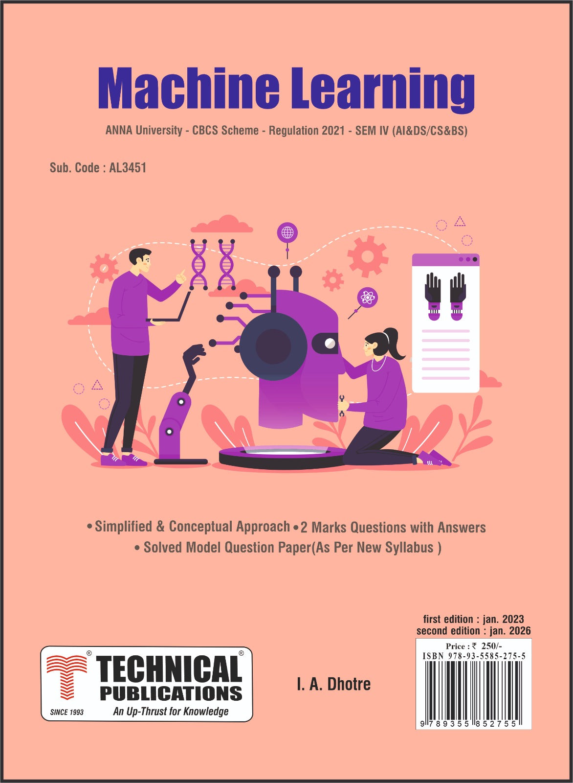 Syllabus Machine Learning (AL3451) UNIT I INTRODUCTION TO MACHINE LEARNING Review of Linear Algebra for machine learning; Introduction and motivation for machine learning; Examples of machine learning applications, Vapnik-Chervonenkis (VC) dimension, Probably Approximately Correct (PAC) learning, Hypothesis spaces, Inductive bias, Generalization, Bias variance trade-off. (Chapter - 1) UNIT II SUPERVISED LEARNING Linear Regression Models : Least squares, single & multiple variables, Bayesian linear regression, gradient descent, Linear Classification Models : Discriminant function - Perceptron algorithm, Probabilistic discriminative model - Logistic regression, Probabilistic generative model - Naïve Bayes, Maximum margin classifier - Support vector machine, Decision Tree, Random Forests (Chapter - 2) UNIT III ENSEMBLE TECHNIQUES AND UNSUPERVISED LEARNING Combining multiple learners : Model combination schemes, Voting, Ensemble Learning - bagging, boosting, stacking, Unsupervised learning : K-means, Instance Based Learning : KNN, Gaussian mixture models and Expectation maximization. (Chapter - 3) UNIT IV NEURAL NETWORKS Multilayer perceptron, activation functions, network training - gradient descent optimization - stochastic gradient descent, error backpropagation, from shallow networks to deep networks - Unit saturation (aka the vanishing gradient problem) - ReLU, hyperparameter tuning, batch normalization, regularization, dropout. (Chapter - 4) UNIT V DESIGN AND ANALYSIS OF MACHINE LEARNING EXPERIMENTS Guidelines for machine learning experiments, Cross Validation (CV) and resampling - K-fold CV, bootstrapping, measuring classifier performance, assessing a single classification algorithm and comparing two classification algorithms - t test, McNemar’s test, K-fold CV paired t test. (Chapter - 5)