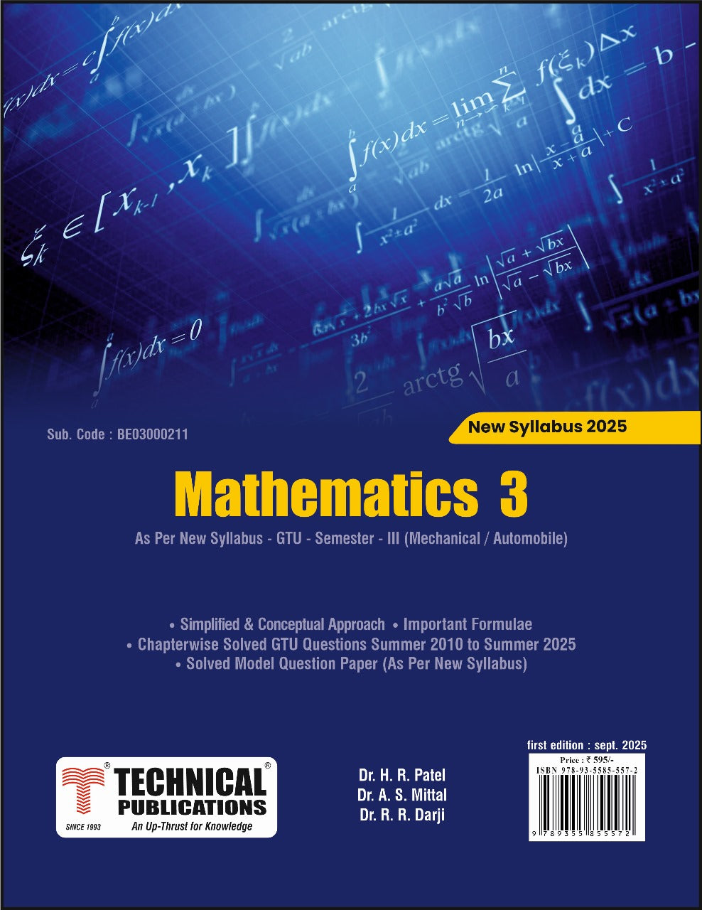 Syllabus Mathematics 3 - (BE03000211) Total Credits = TH / 30 Assessment Pattern and Marks Total Marks Theory Tutorial / Practical ESE (E) PA (M) PA / (I) TW / SL (I) ESE (V) 04 70 30 20 30 50 200 Unit No. Content 1. Fourier Series : Periodic functions, Fourier series of functions of 2 or any other period, Dirichlet’s condition for convergence of Fourier series, Fourier series of even and odd functions, Half-range Fourier series. (Chapter - 1) 2. Partial Differential Equations (PDEs) : Formation of partial differential equations, solution of first order linear and non-linear partial differential equations, Charpit’s method. Solution of homogeneous and nonhomogeneous linear partial differential equations of second and higher order by complementary function and particular integral method, classification of second order linear partial differential equations, method of separation of variables, one-dimensional wave equation and heat equation. (Chapter - 2) 3. Finite Differences and Interpolation : Finite difference operators and their relations, Newton’s forward and backward difference methods, Lagrange’s interpolation method, Inverse interpolation, Newton’s divided difference method. (Chapter - 3) 4. Numerical Differentiation and Integration : Numerical Differentiation : Derivatives using forward difference and backward difference formulae Numerical Integration : Newton-Cotes quadrature formulae, Trapezoidal rule, Simpson’s rules, Gaussian integration, Case studies. (Chapter - 4) 5. Numerical Solution of Ordinary Differential Equations : Picard’s method, Euler’s method, Runge-Kutta 2nd and 4th order method, Case studies. (Chapter - 5) 6. Laplace Transforms : Laplace transform and Inverse Laplace transform, linearity, first shifting theorem (s-shifting), transforms of derivatives and integrals, ODEs, unit step function (Heaviside function), second shifting theorem (t-Shifting), Laplace transform of periodic functions, short impulses, Dirac’s delta function, convolution, integral equations, differentiation and integration of transforms, ODEs with variable coefficients, systems of ODEs. (Chapter - 6)